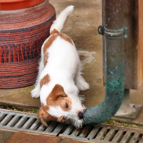 ... hat keinen Wassernapf und muss aus der Regenrinne trinken!
